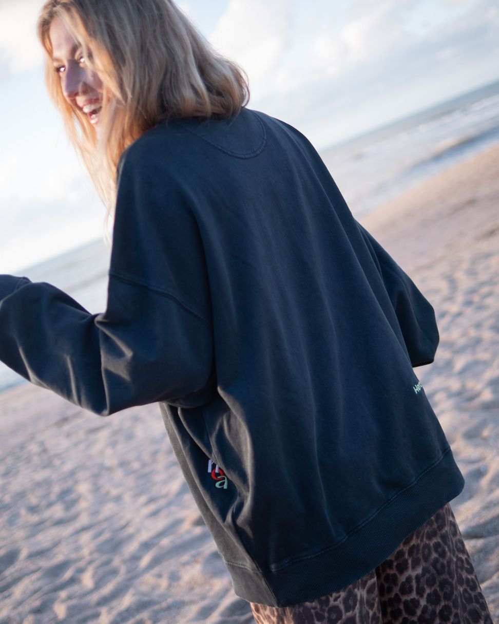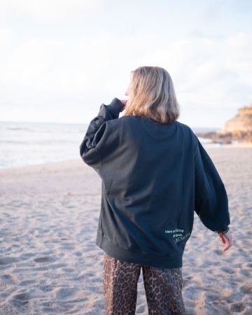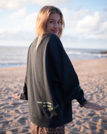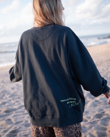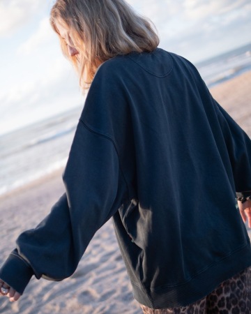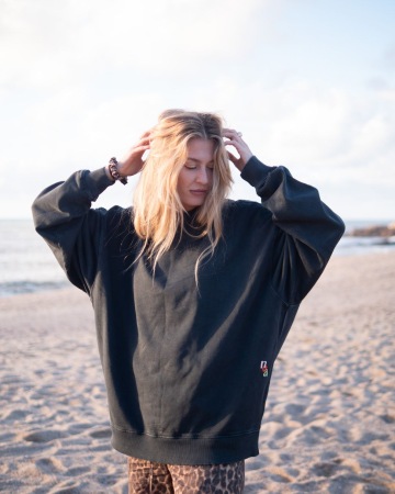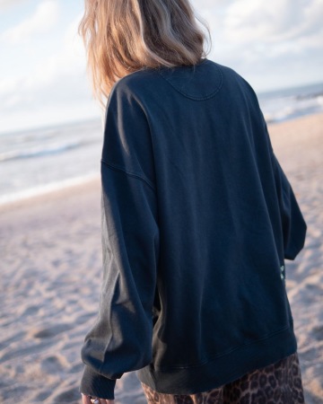 Crewneck je “washed” s efektem seprané černé barvy. Kombinujeme ho třeba právě s all black outfitem, kdy nechceme být úplně celé černé a trochu ho zjemnit a odstíny odstupňovat.