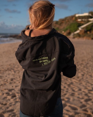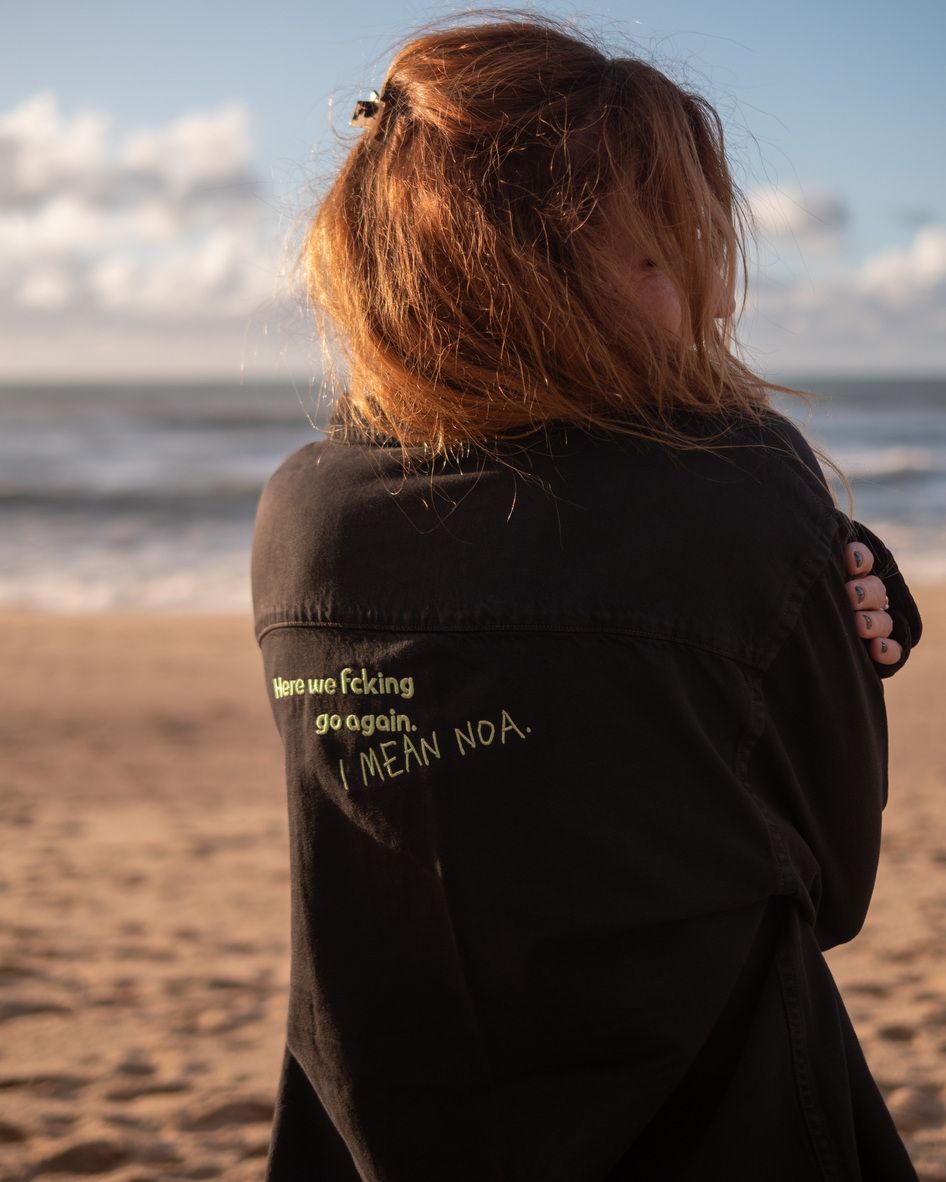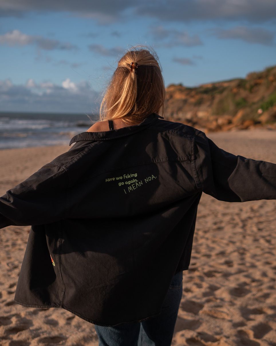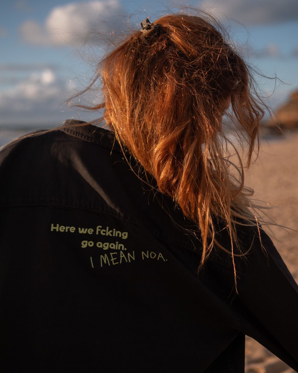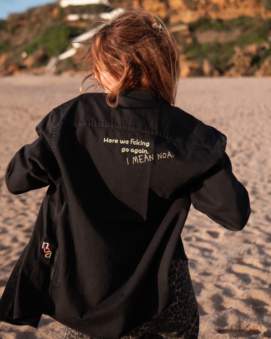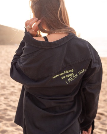 Najdeš na ní výšivku NOA a HERE WE FCKIN GO AGAIN. I MEAN NOA.