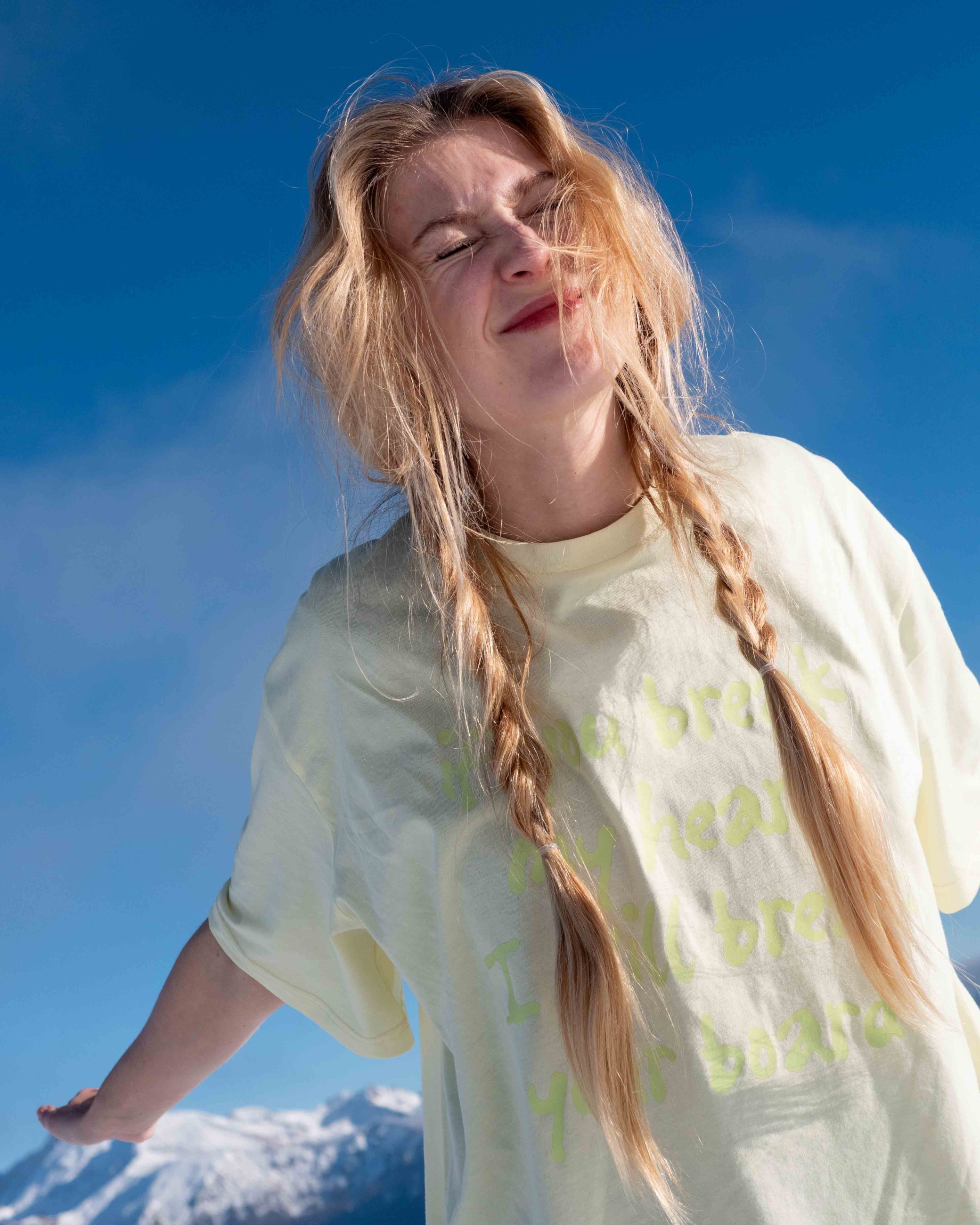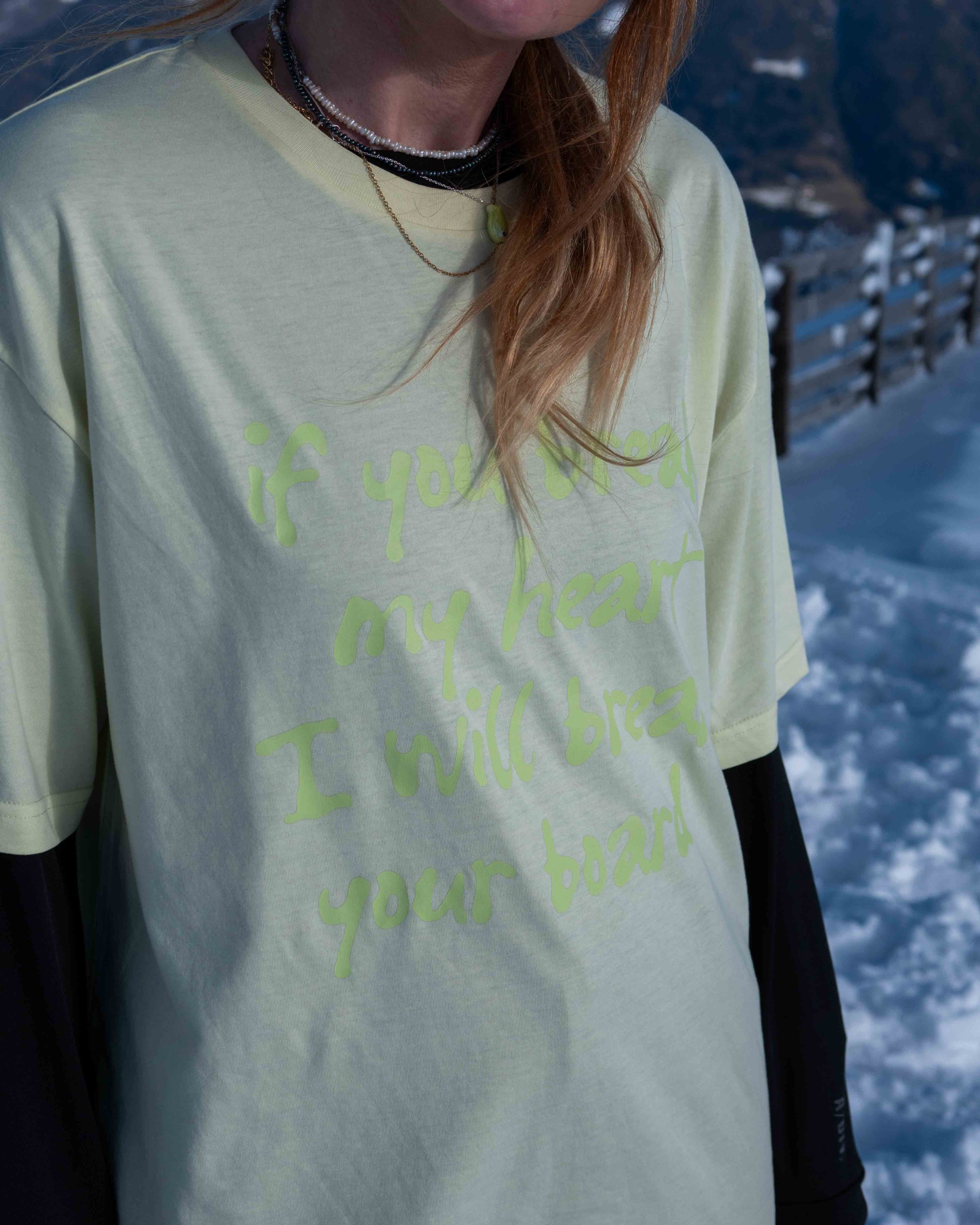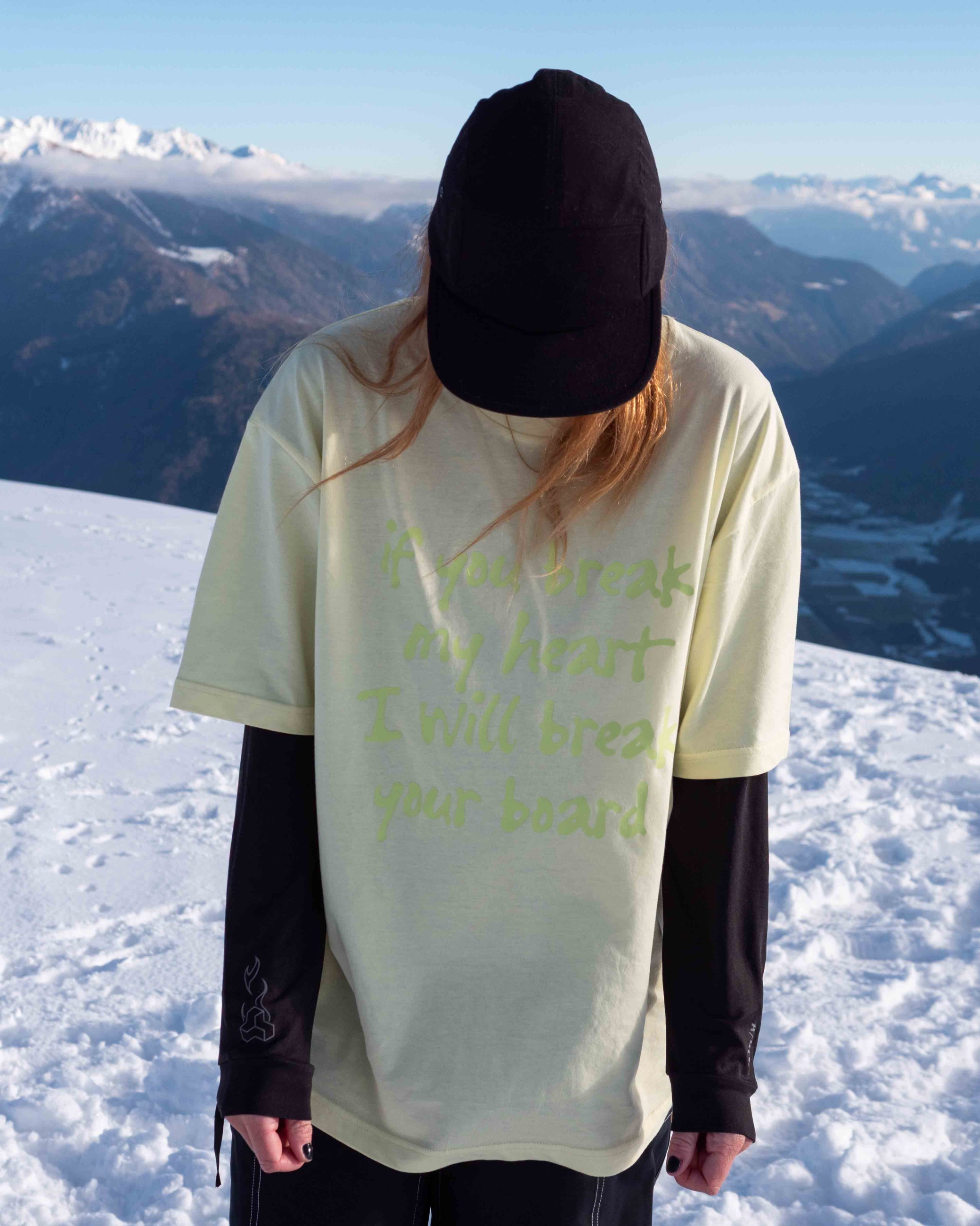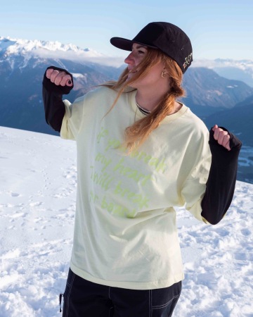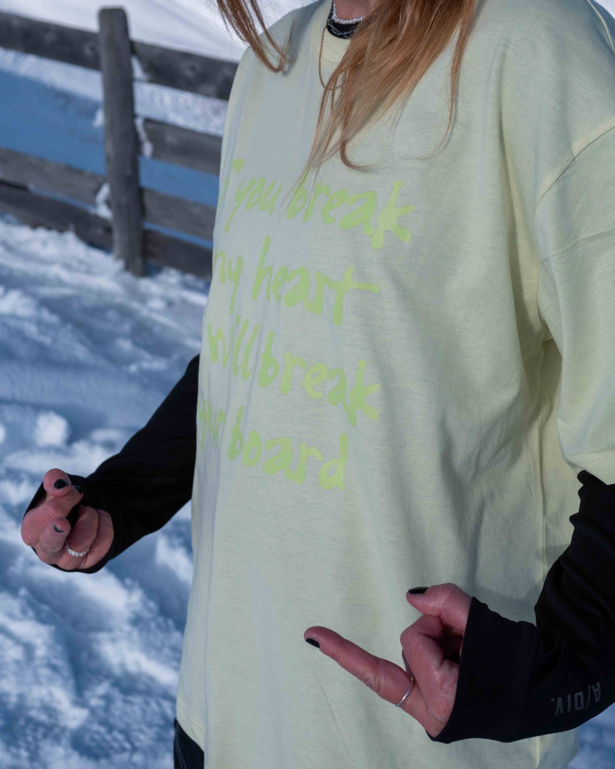 “If you break my heart, I will break your board” matchy triko s naší (tvojí?) NOA QUEEN hoodie. Lehké, jemné triko, jako druhá kůže. My v něm aktuálně žijeme! Na horách jsme ho vrstvily s termo oblečením, ale tahle (trend on 2026) barva ti ozvláštní i casual outfit do města nebo na pláž.